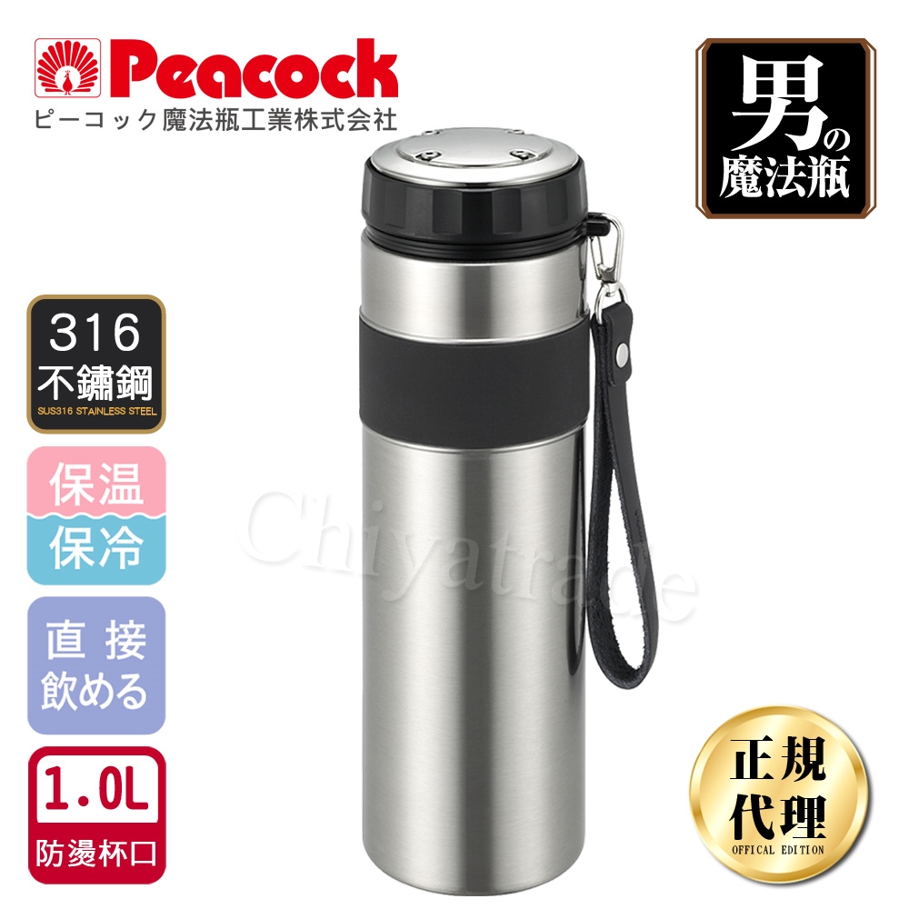 【日本孔雀Peacock】高質感品味316不鏽鋼保冷保溫杯1000ML(附牛皮隨身提帶)-品味黑