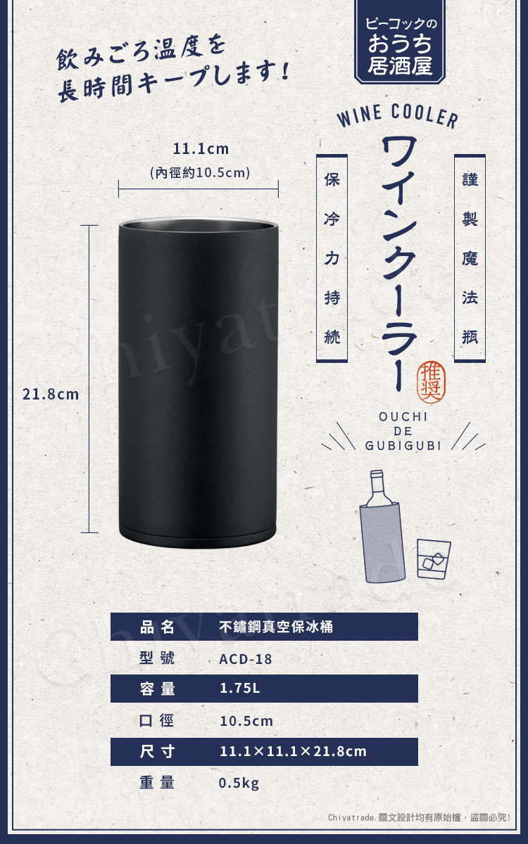 【日本孔雀Peacock】不鏽鋼真空斷熱 保冰桶 酒器 兼容多種酒瓶型 保冷保溫-磨砂黑